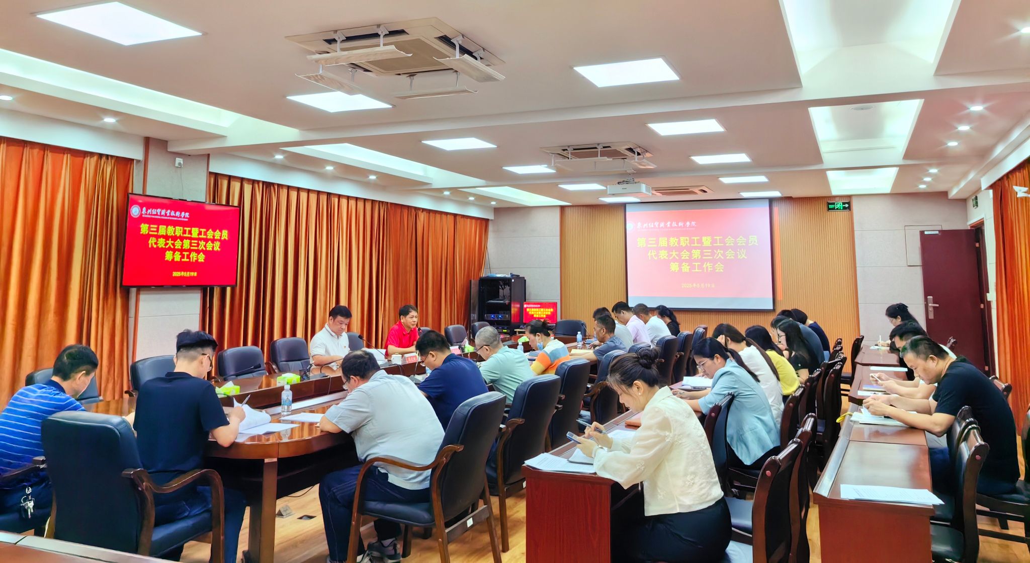 5月19日上午,学校工会在行政楼206会议室召开第三届教职工暨工会会员代表大会第三次会议(以下简称“双代会”)筹备工作会。党委书记廖伏树出席会议并讲话,党委副书记、工会主席陈金通主持会议。全体工会委员、二级工会主席及筹备工作组组长参加会议。